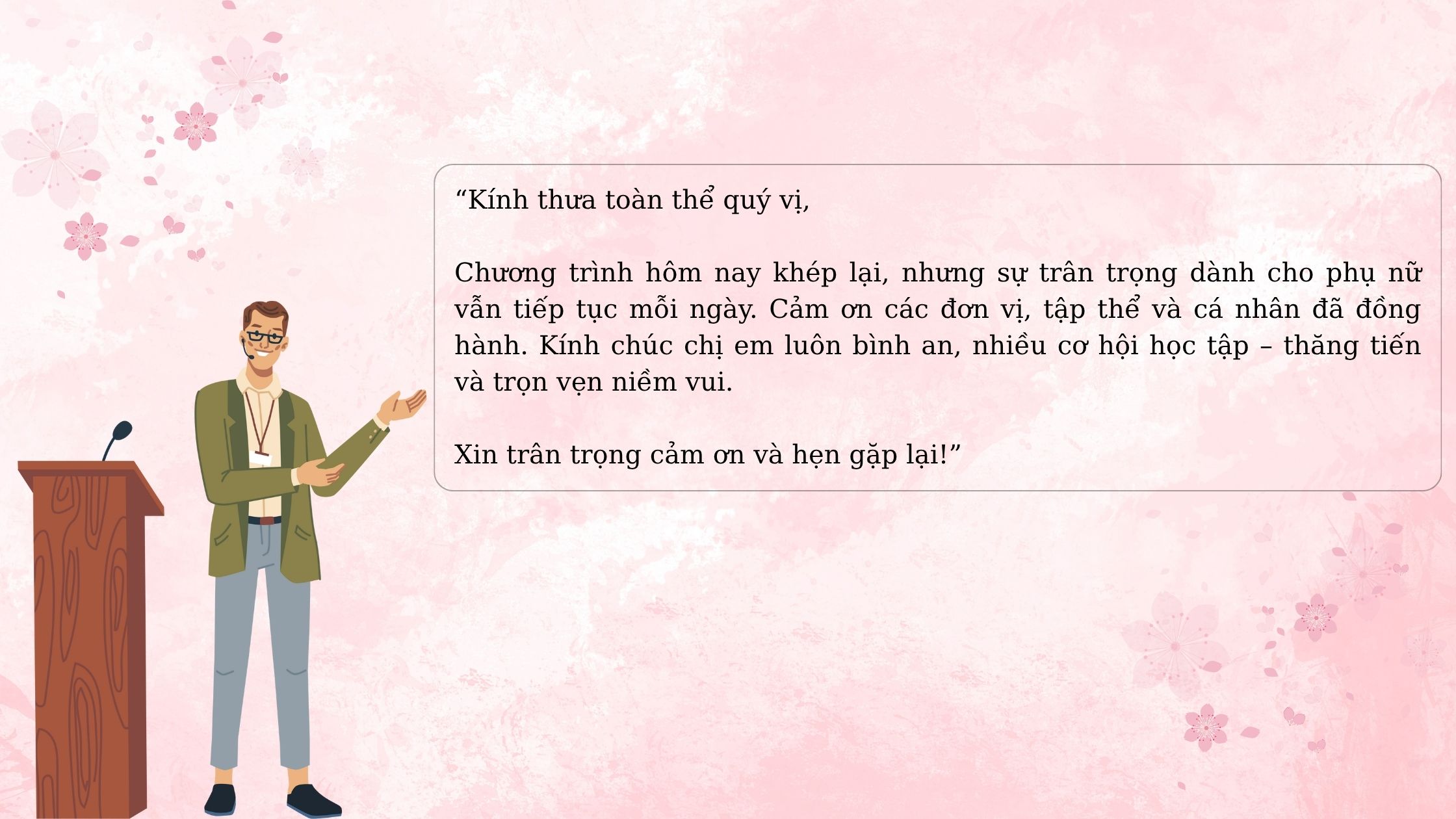 Chương trình hôm nay khép lại, nhưng sự trân trọng dành cho phụ nữ vẫn tiếp tục mỗi ngày. Cảm ơn các đơn vị, tập thể và cá nhân đã đồng hành. Kính chúc chị em luôn bình an, nhiều cơ hội học tập – thăng tiến và trọn vẹn niềm vui. Xin trân trọng cảm ơn và hẹn gặp lại!