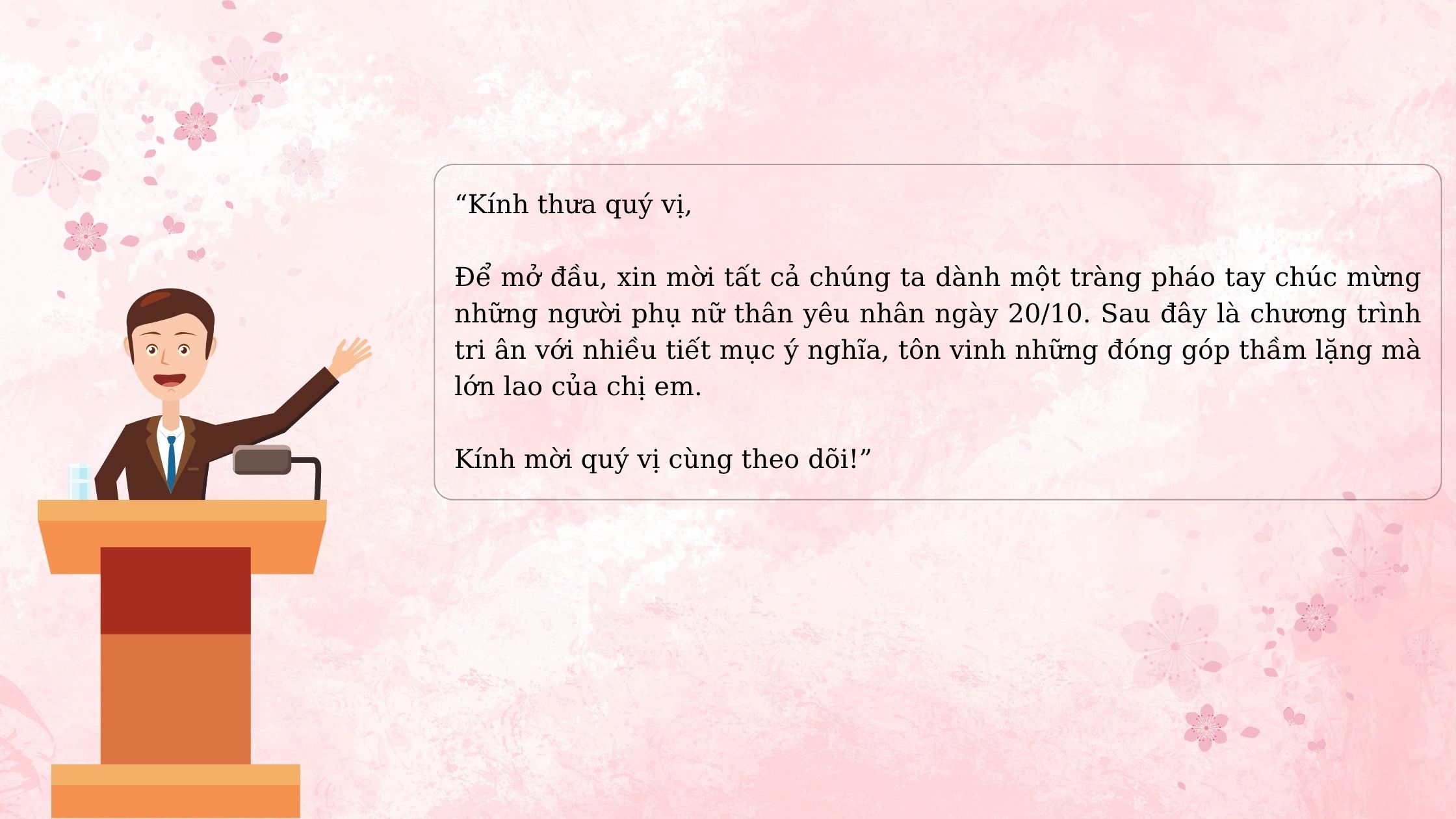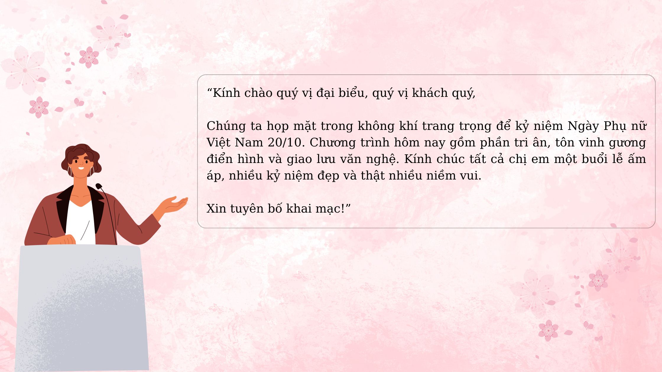 Chúng ta họp mặt trong không khí trang trọng để kỷ niệm Ngày Phụ nữ Việt Nam 20/10. Chương trình hôm nay gồm phần tri ân, tôn vinh gương điển hình và giao lưu văn nghệ. Kính chúc tất cả chị em một buổi lễ ấm áp, nhiều kỷ niệm đẹp và thật nhiều niềm vui. Xin tuyên bố khai mạc!
