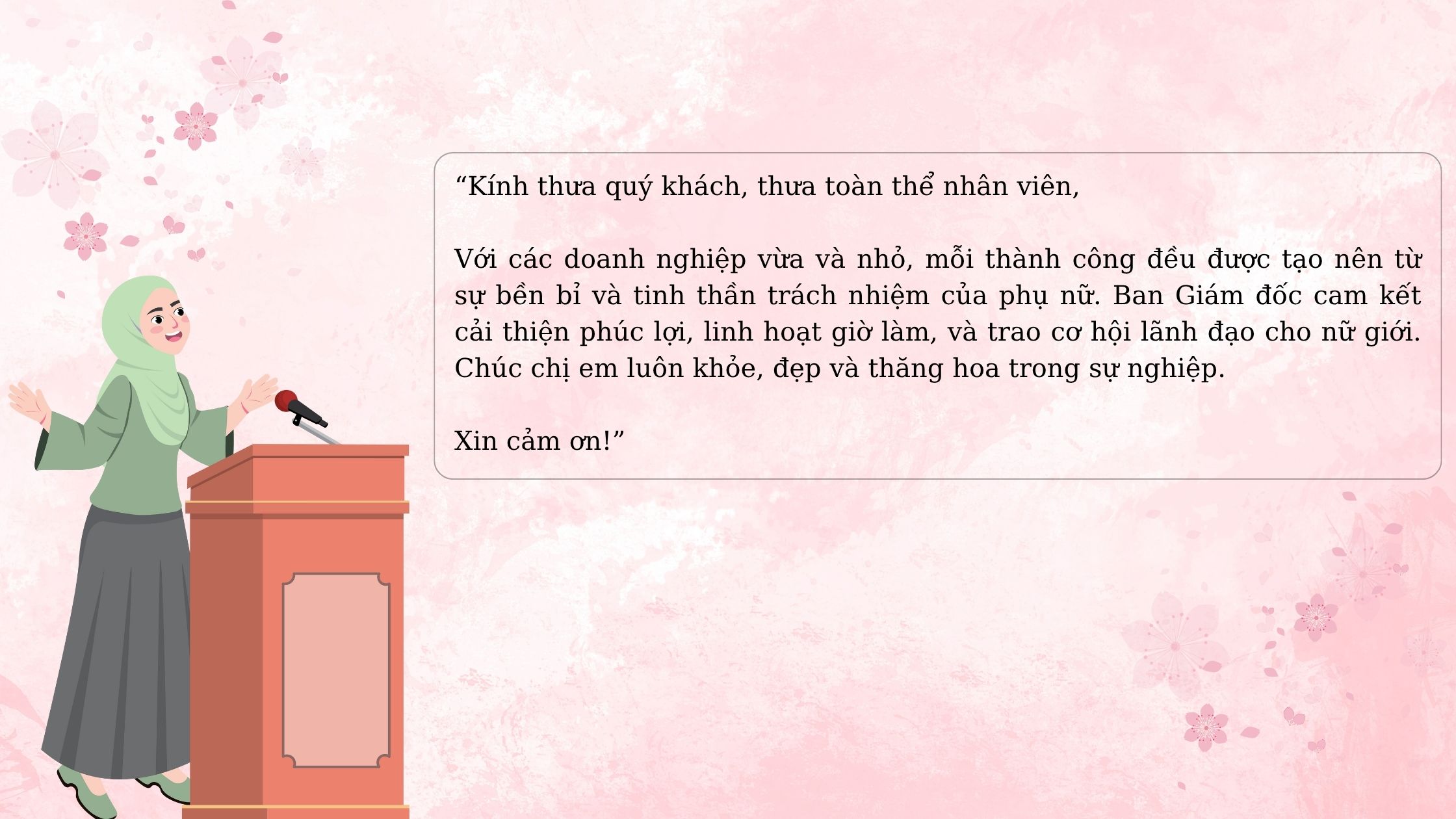 Với các doanh nghiệp vừa và nhỏ, mỗi thành công đều được tạo nên từ sự bền bỉ và tinh thần trách nhiệm của phụ nữ. Ban Giám đốc cam kết cải thiện phúc lợi, linh hoạt giờ làm, và trao cơ hội lãnh đạo cho nữ giới. Chúc chị em luôn khỏe, đẹp và thăng hoa trong sự nghiệp. Xin cảm ơn!