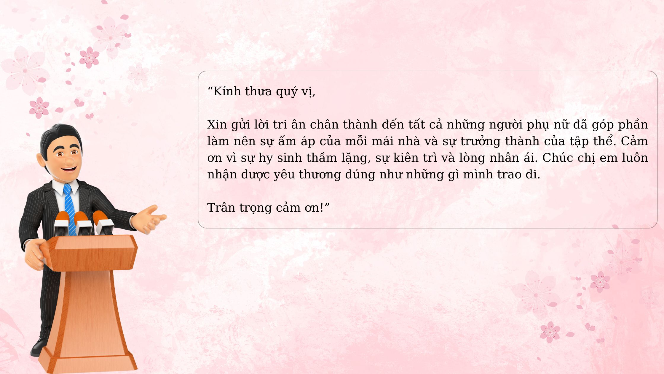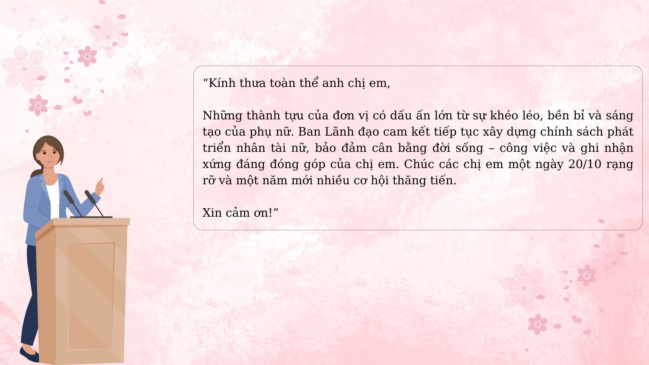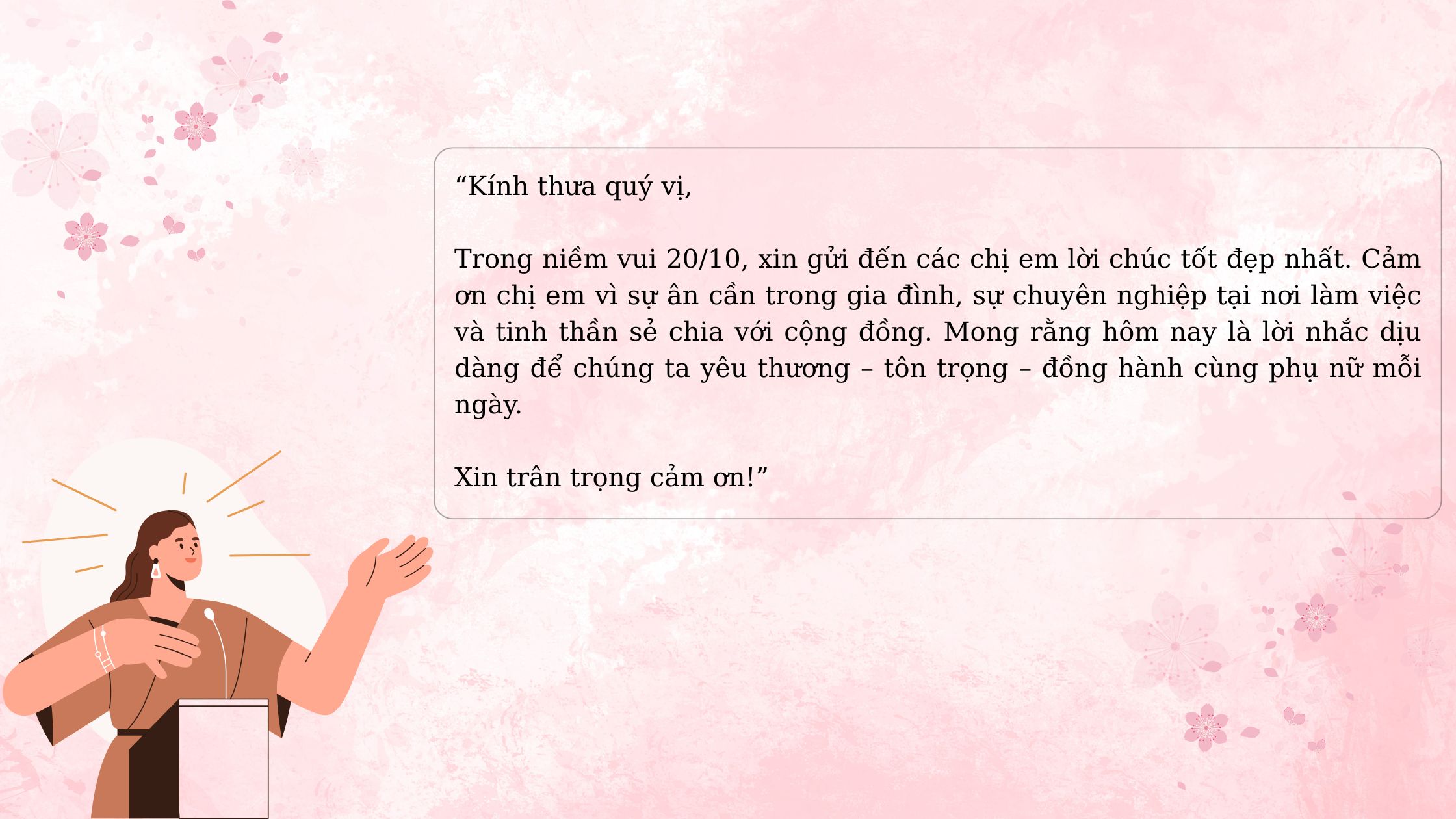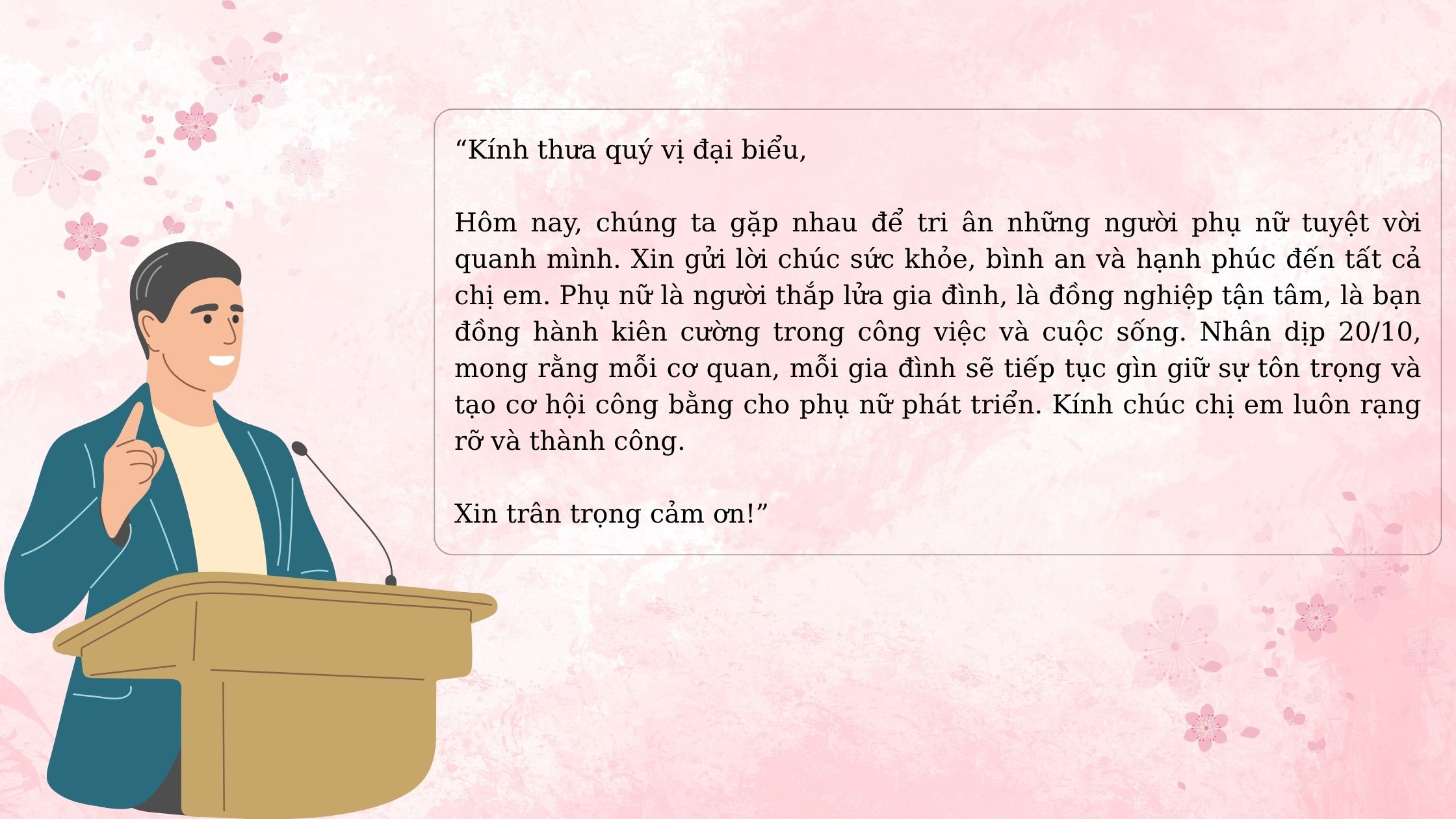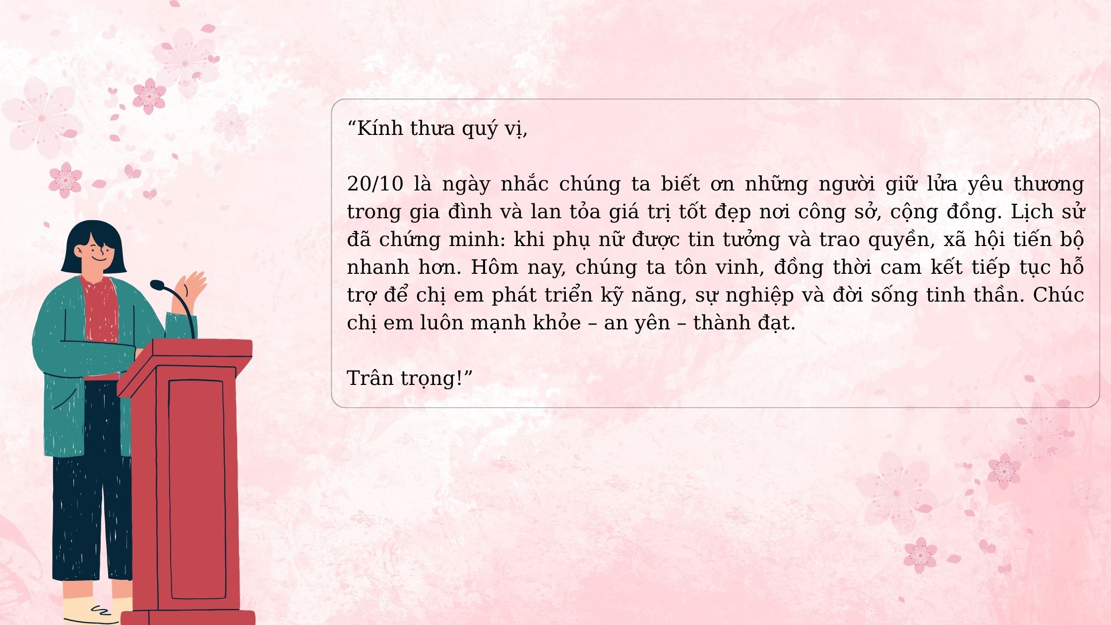 Hôm nay, chúng ta gặp nhau để tri ân những người phụ nữ tuyệt vời quanh mình. Xin gửi lời chúc sức khỏe, bình an và hạnh phúc đến tất cả chị em. Phụ nữ là người thắp lửa gia đình, là đồng nghiệp tận tâm, là bạn đồng hành kiên cường trong công việc và cuộc sống. Nhân dịp 20/10, mong rằng mỗi cơ quan, mỗi gia đình sẽ tiếp tục gìn giữ sự tôn trọng và tạo cơ hội công bằng cho phụ nữ phát triển. Kính chúc chị em luôn rạng rỡ và thành công. Xin trân trọng cảm ơn.