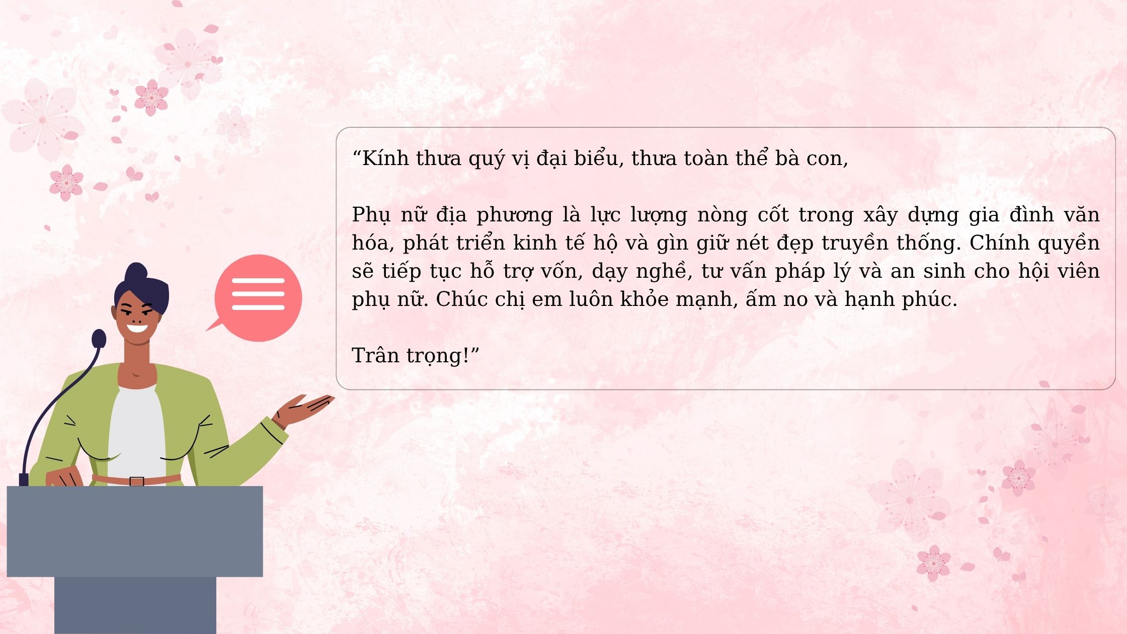 Phụ nữ địa phương là lực lượng nòng cốt trong xây dựng gia đình văn hóa, phát triển kinh tế hộ và gìn giữ nét đẹp truyền thống. Chính quyền sẽ tiếp tục hỗ trợ vốn, dạy nghề, tư vấn pháp lý và an sinh cho hội viên phụ nữ. Chúc chị em luôn khỏe mạnh, ấm no và hạnh phúc. Trân trọng!