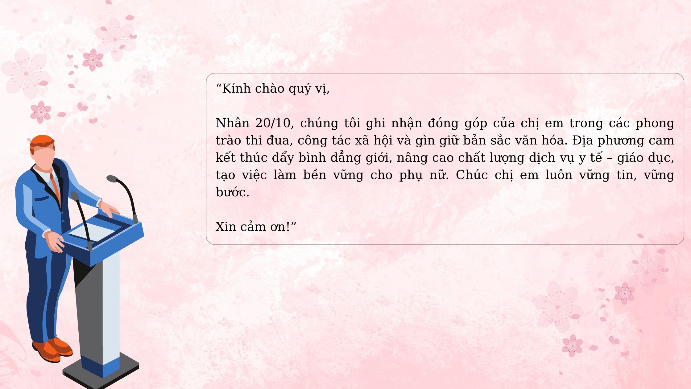 Nhân 20/10, chúng tôi ghi nhận đóng góp của chị em trong các phong trào thi đua, công tác xã hội và gìn giữ bản sắc văn hóa. Địa phương cam kết thúc đẩy bình đẳng giới, nâng cao chất lượng dịch vụ y tế – giáo dục, tạo việc làm bền vững cho phụ nữ. Chúc chị em luôn vững tin, vững bước. Xin cảm ơn!