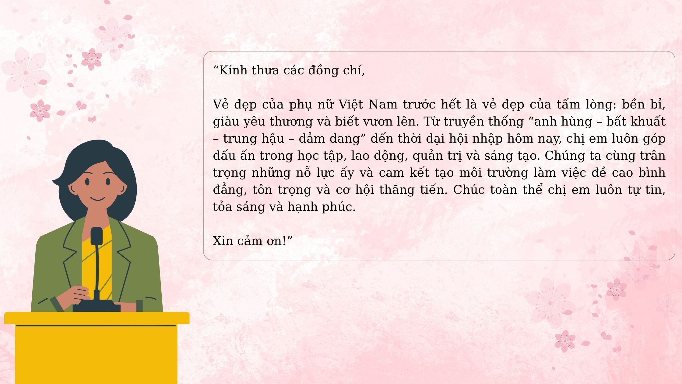 Vẻ đẹp của phụ nữ Việt Nam trước hết là vẻ đẹp của tấm lòng: bền bỉ, giàu yêu thương và biết vươn lên. Từ truyền thống “anh hùng – bất khuất – trung hậu – đảm đang” đến thời đại hội nhập hôm nay, chị em luôn góp dấu ấn trong học tập, lao động, quản trị và sáng tạo. Chúng ta cùng trân trọng những nỗ lực ấy và cam kết tạo môi trường làm việc đề cao bình đẳng, tôn trọng và cơ hội thăng tiến. Chúc toàn thể chị em luôn tự tin, tỏa sáng và hạnh phúc. Xin cảm ơn!