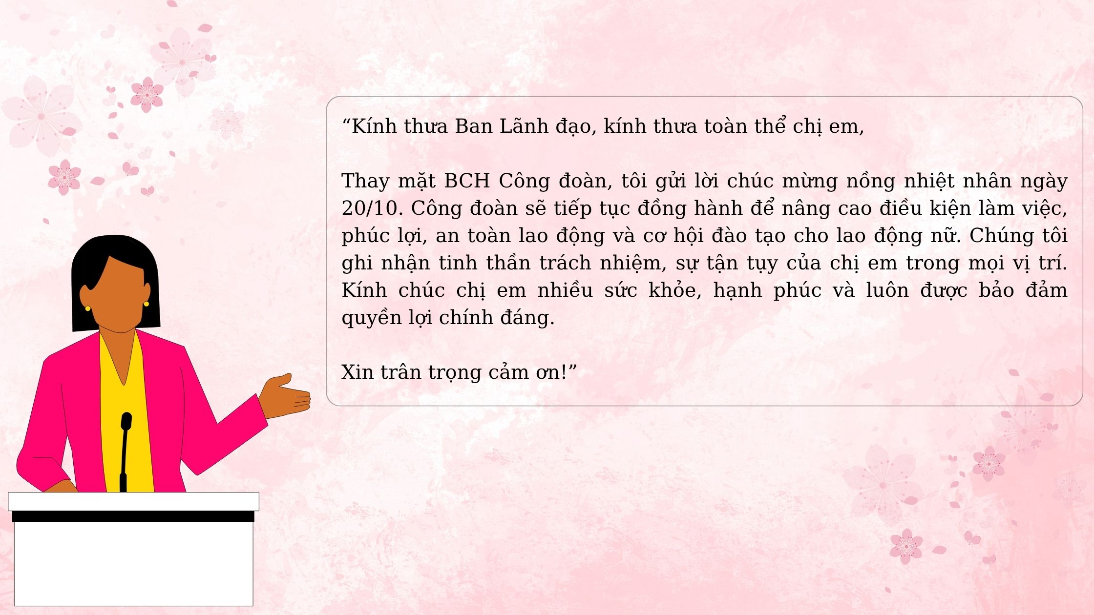 Thay mặt BCH Công đoàn, tôi gửi lời chúc mừng nồng nhiệt nhân ngày 20/10. Công đoàn sẽ tiếp tục đồng hành để nâng cao điều kiện làm việc, phúc lợi, an toàn lao động và cơ hội đào tạo cho lao động nữ. Chúng tôi ghi nhận tinh thần trách nhiệm, sự tận tụy của chị em trong mọi vị trí. Kính chúc chị em nhiều sức khỏe, hạnh phúc và luôn được bảo đảm quyền lợi chính đáng. Xin trân trọng cảm ơn!