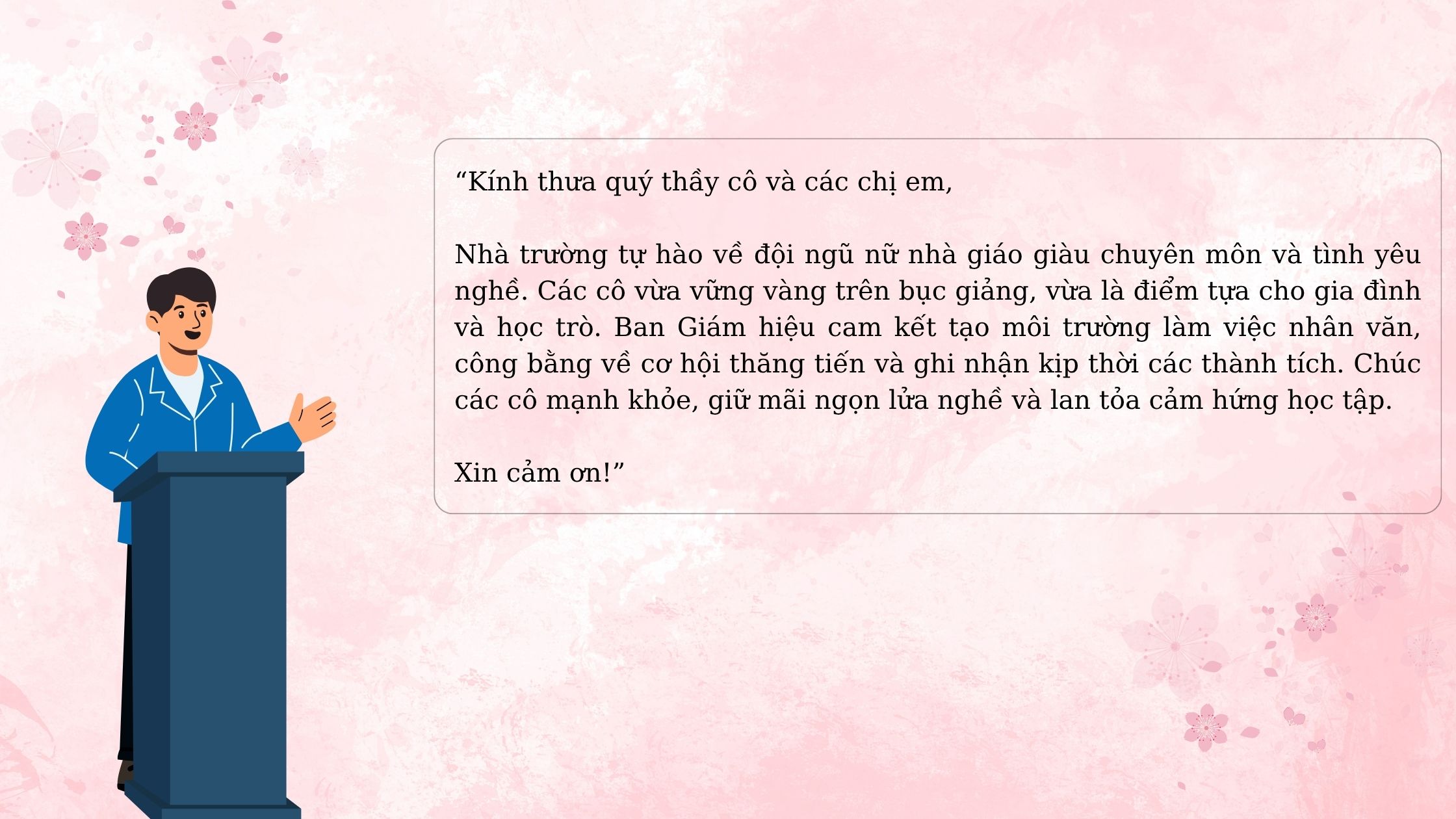 Nhà trường tự hào về đội ngũ nữ nhà giáo giàu chuyên môn và tình yêu nghề. Các cô vừa vững vàng trên bục giảng, vừa là điểm tựa cho gia đình và học trò. Ban Giám hiệu cam kết tạo môi trường làm việc nhân văn, công bằng về cơ hội thăng tiến và ghi nhận kịp thời các thành tích. Chúc các cô mạnh khỏe, giữ mãi ngọn lửa nghề và lan tỏa cảm hứng học tập. Xin cảm ơn!