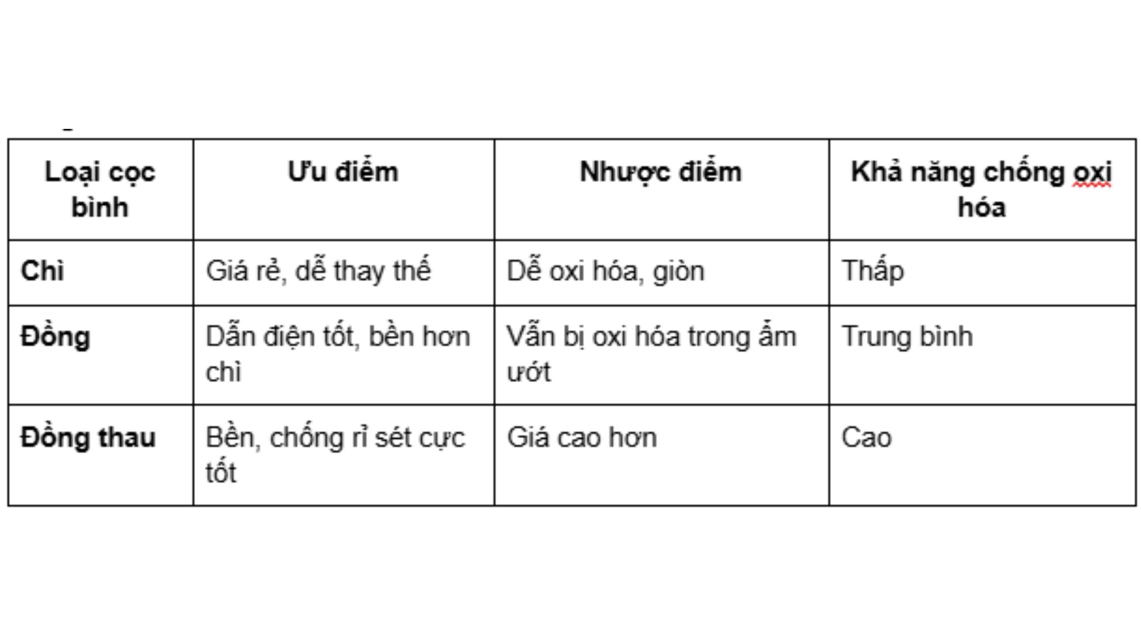 4. So sánh các loại cọc bình và khả năng chống oxi hóa