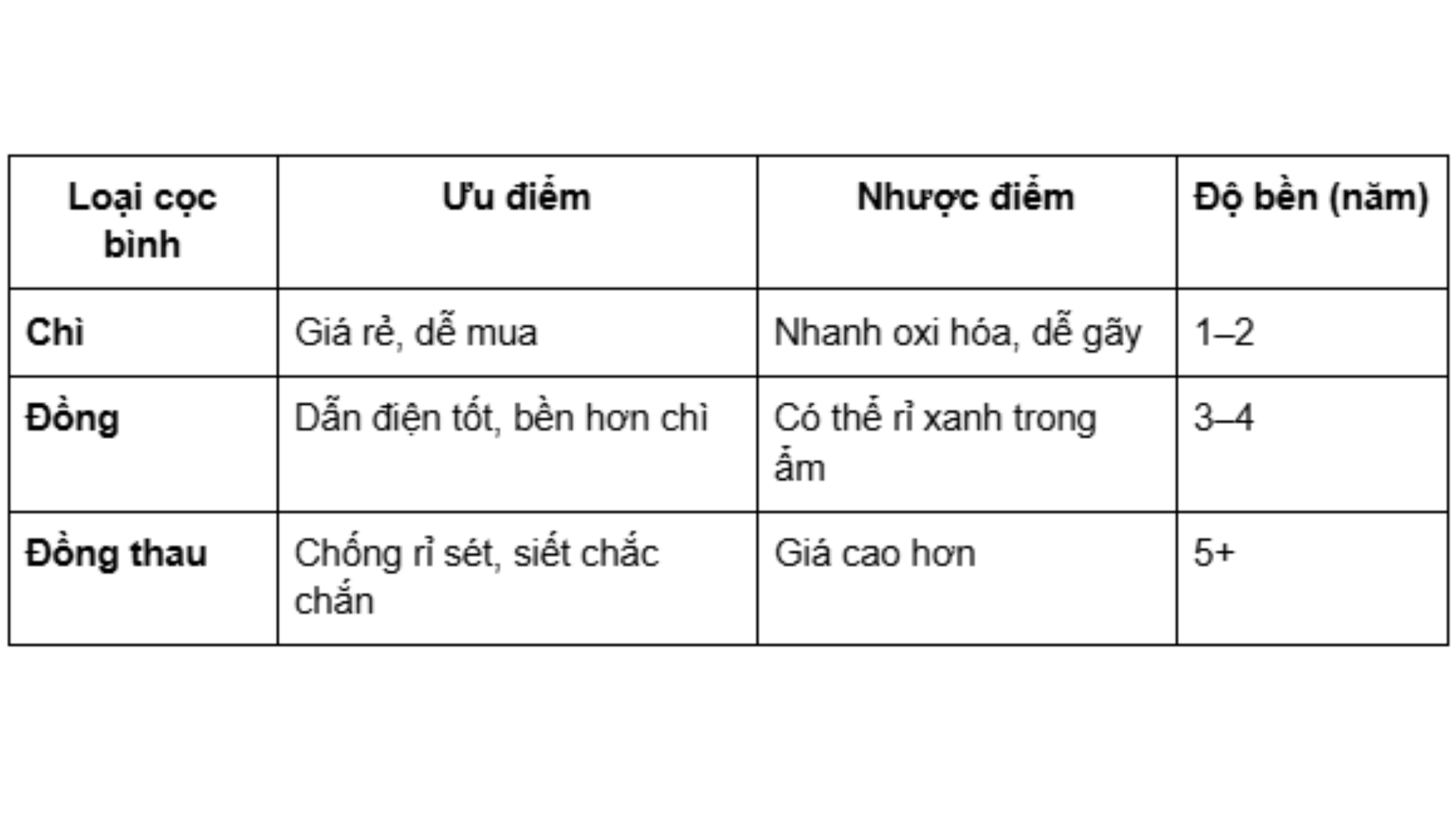 - Cọc đồng: cân bằng giữa giá thành và hiệu năng, tuổi thọ 3–4 năm.