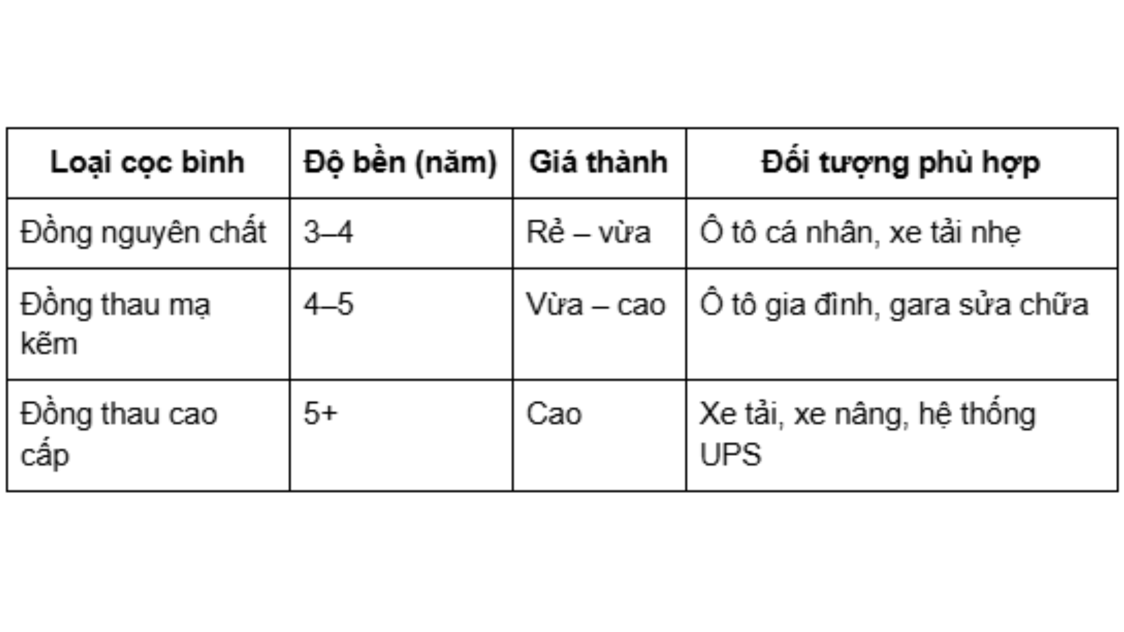 - Cọc bình chì: giá rẻ, dễ sản xuất, nhưng dễ bị oxi hóa, nhanh hỏng.