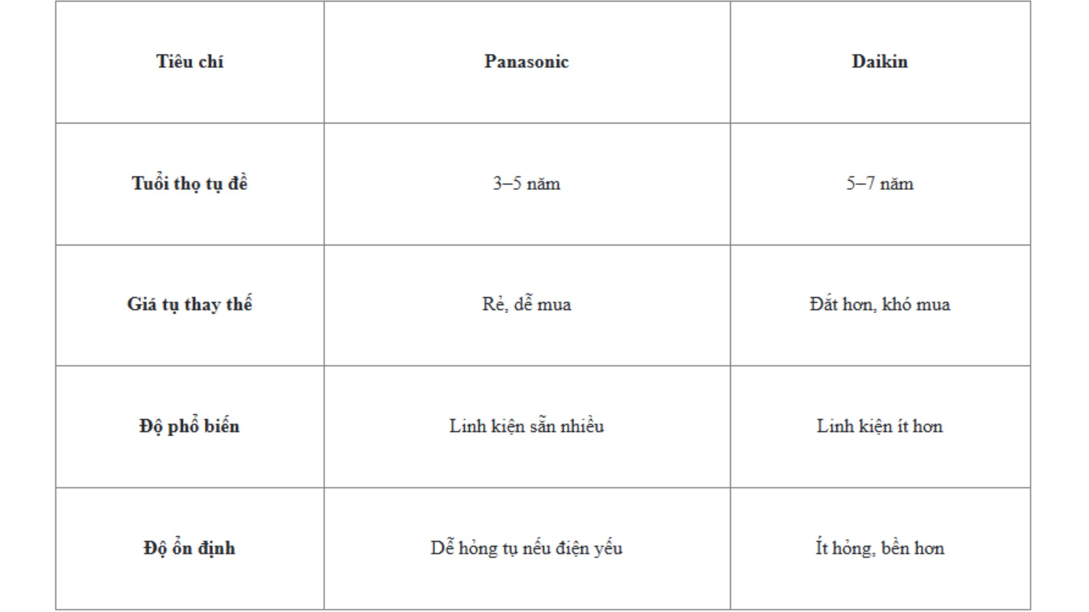 👉 Nếu ưu tiên giá rẻ, dễ sửa, chọn Panasonic. Nếu ưu tiên độ bền, ít hỏng tụ, chọn Daikin.