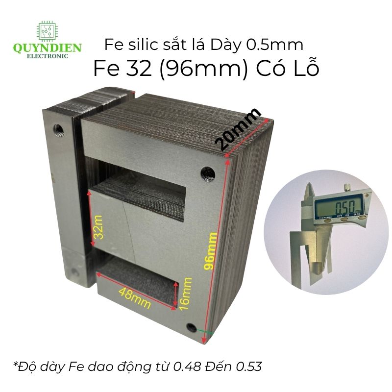Fe sắt silic EI lá mỏng 0.5mm – kích thước 32mm (cao 96mm) có lỗ, là vật liệu chuyên dụng cho chế tạo lõi biến áp, cuộn cảm, máy biến thế, thiết bị nguồn xung, ứng dụng rộng rãi trong công nghiệp điện tử, dân dụng, trường học và nghiên cứu.