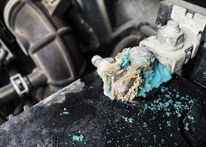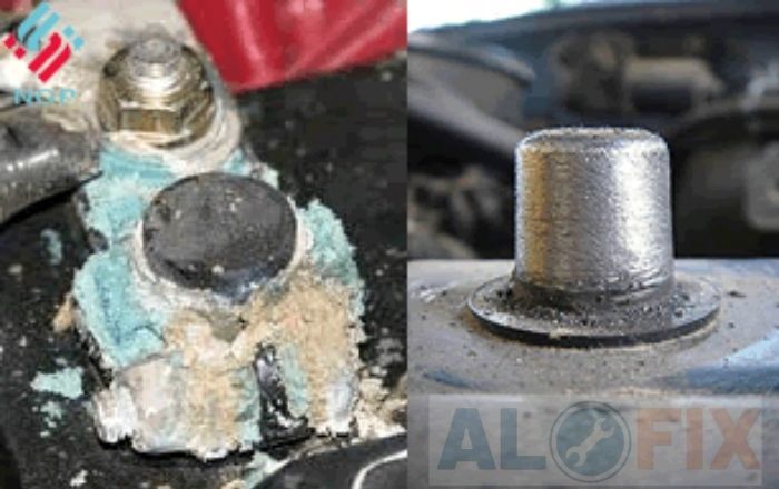 🔎 Dấu hiệu: Xuất hiện lớp muối trắng/xanh trên đầu cọc bình.