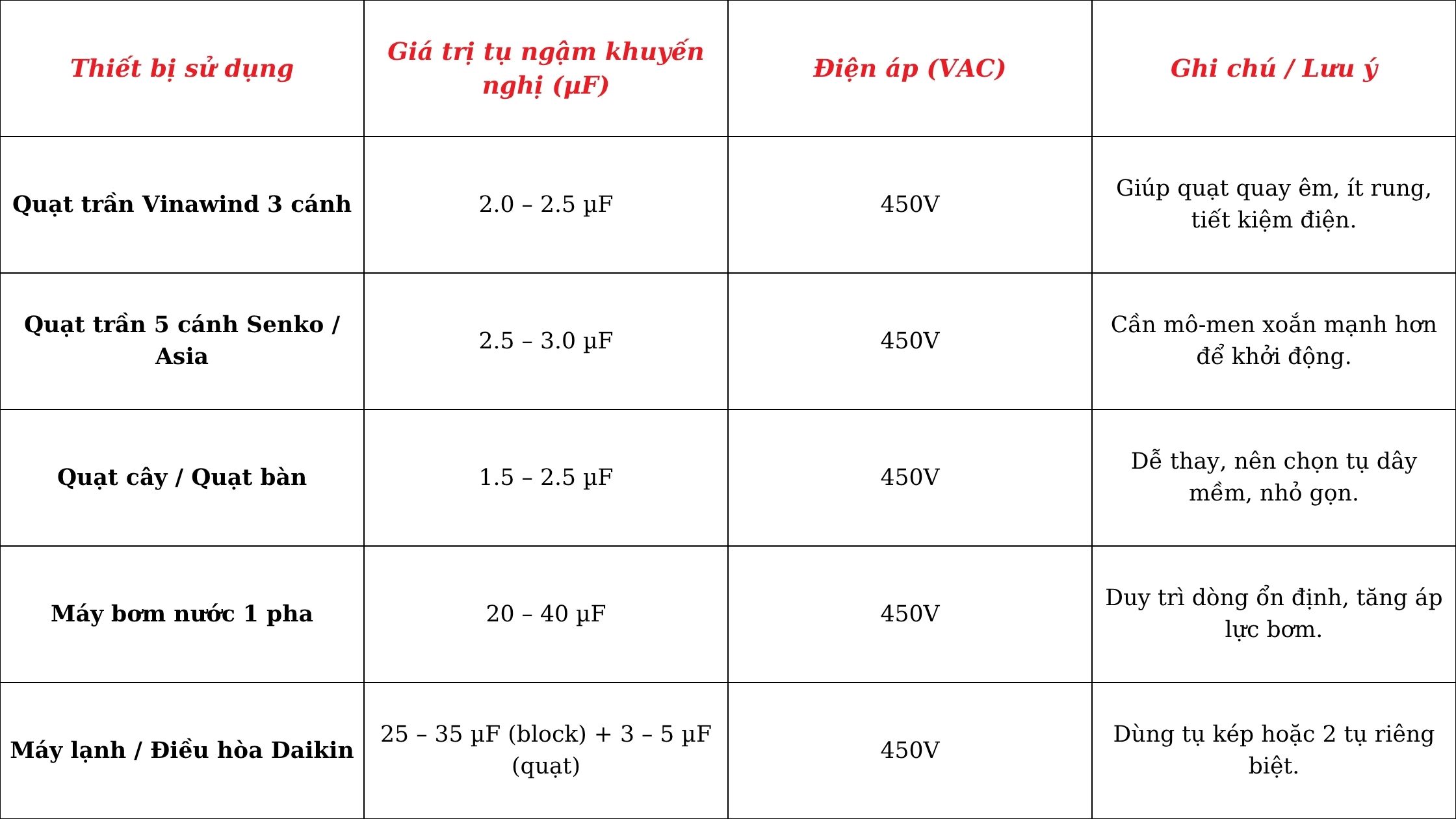 Chọn đúng tụ ngậm không chỉ giúp thiết bị hoạt động ổn định mà còn kéo dài tuổi thọ motor và giảm tiêu hao điện năng. Dưới đây là hướng dẫn chọn tụ phù hợp cho từng loại thiết bị phổ biến: