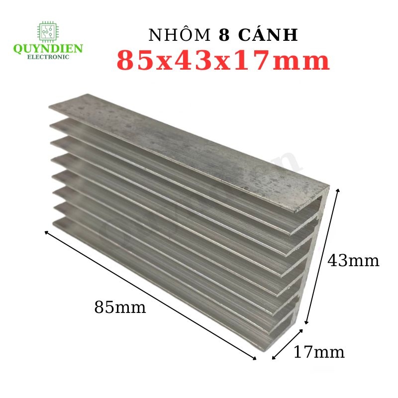Nhôm tản nhiệt 85×43×17 mm – 8 cánh là lựa chọn lý tưởng. Thanh nhôm dài ~85 mm, cao 43 mm và chân đế dày 17 mm giúp tản nhiệt nhanh, ổn định. Thiết kế 8 cánh đều đặn, phay sắc nét, phù hợp mọi không gian chật hẹp.