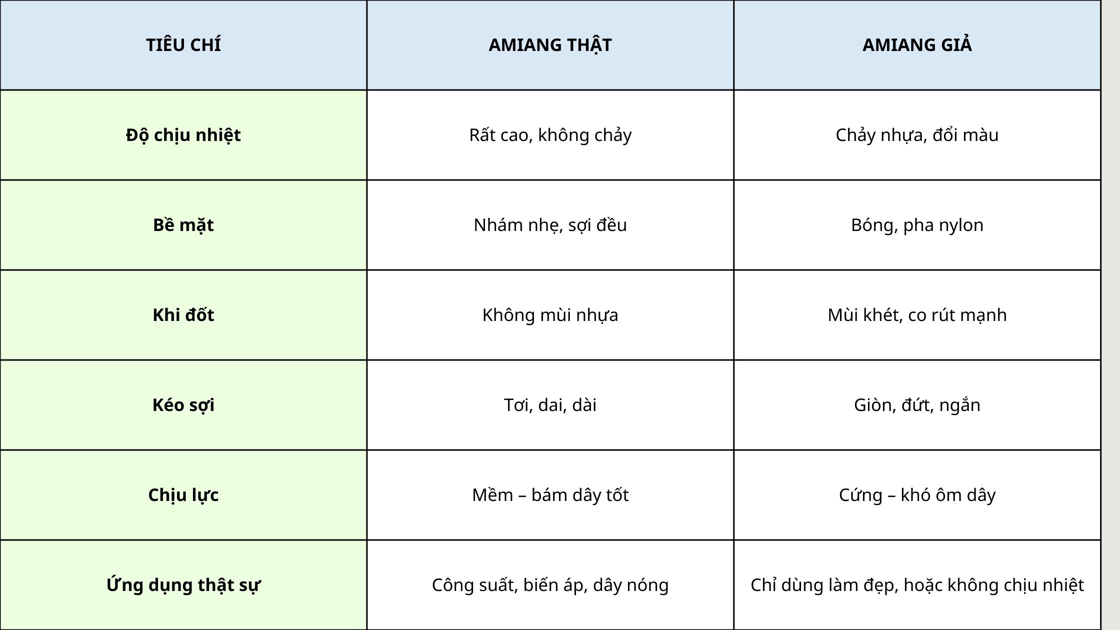 4. Bảng so sánh chi tiết “Amiang thật” – “Amiang giả” (ngắn gọn, dễ hiểu, nhìn là biết ngay)