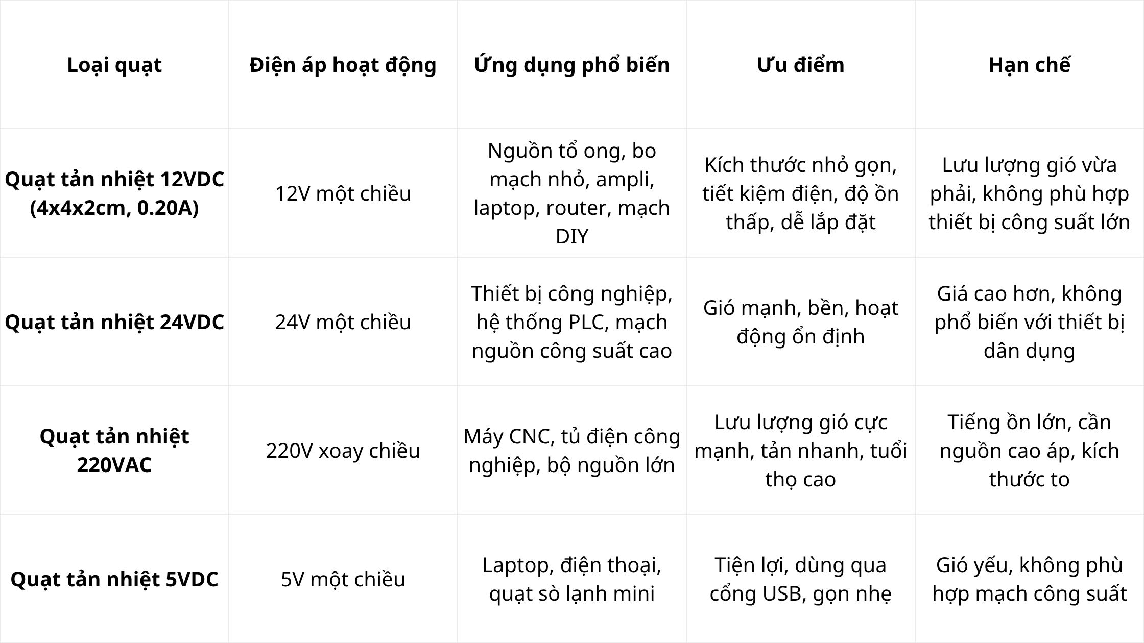 Nhìn vào bảng trên, dễ thấy quạt tản nhiệt 12VDC chính là lựa chọn phổ biến nhất cho các dự án DIY, sinh viên kỹ thuật, thợ điện tử và thiết bị dân dụng.