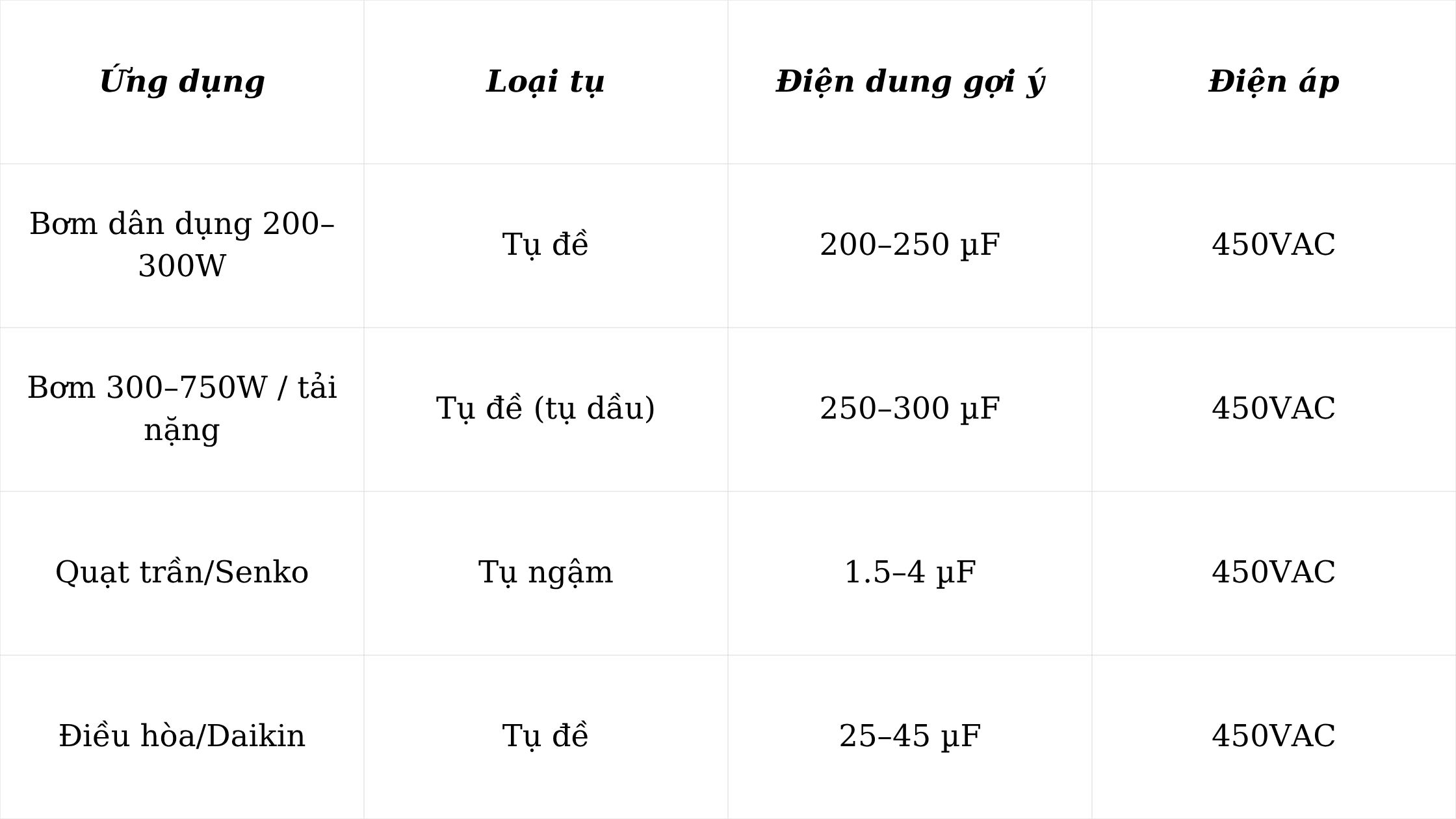 - Tụ ngậm KAPA (Run): duy trì chạy êm – tiết kiệm điện, ~1–80 µF.