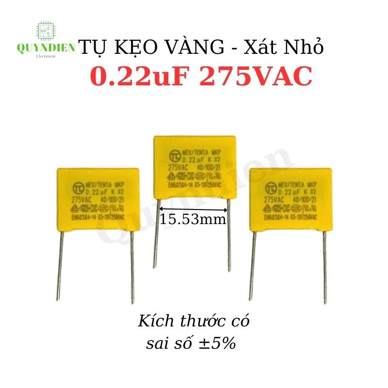 Tụ kẹo vàng 0.22uF 275VAC (ký hiệu 224K), loại MKP-X2, kích thước nhỏ gọn, chống cháy, chuyên dùng để lọc nhiễu, lọc xung và bảo vệ mạch điện đầu vào. Thích hợp cho các mạch nguồn AC, adapter, biến áp, driver LED và thiết bị điện tử dân dụng.