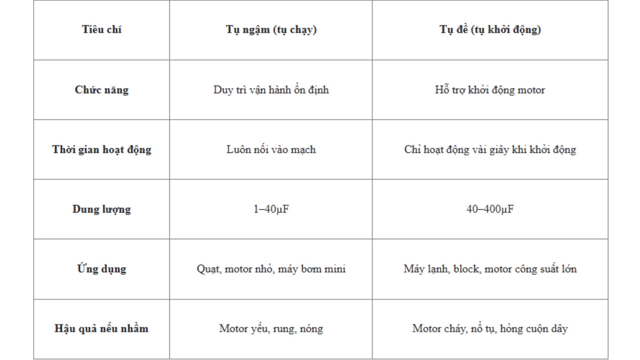 👉 Như vậy, tụ ngậm nhỏ – chạy liên tục, tụ đề lớn – chỉ khởi động rồi ngắt.