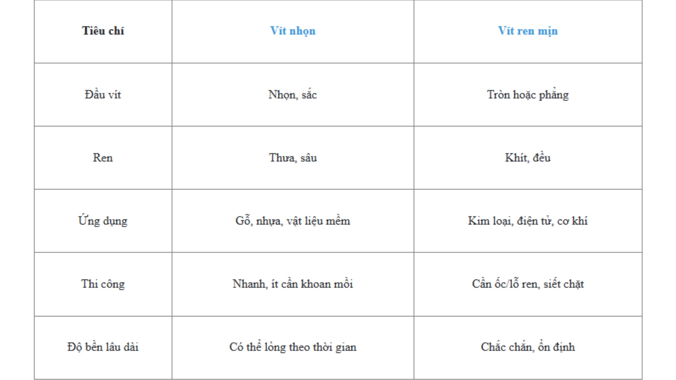 👉 Vít nhọn rẻ hơn, bán chạy trong xây dựng dân dụng. Vít ren mịn giá cao hơn nhưng cần thiết trong điện tử và cơ khí.
